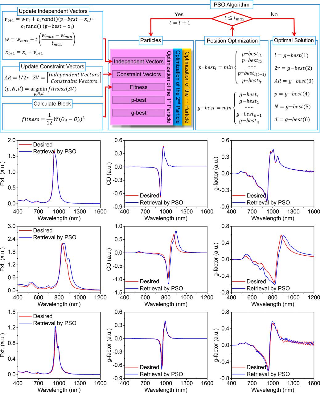 图3. 基于PSO算法反演结构特征参数的示意图,以及仿真结果与理论预期的对比。 为解决金纳米棒螺旋结构在逆向设计中的关键难题,刘洋团队创新性地融合预测网络与PSO算法,以目标光谱与预测光谱之间的重叠系数作为适应度函数,并引入线性递减惯性权重策略,有效平衡全局搜索与局部优化,实现了从目标光学响应到结构参数的快速、精准反演。该算法仅需6秒即可输出与目标光学非对称性相匹配的结构参数。基于反演结果构建的金纳米棒螺旋扭曲微结构在实验中表现出与理论高度一致的光学行为(图3)。上述成果表明,刘洋老师团队已成功实现对该类微结构光学非对称性的准确预测,并具备通过光学响应逆向推断其形貌特征的能力。