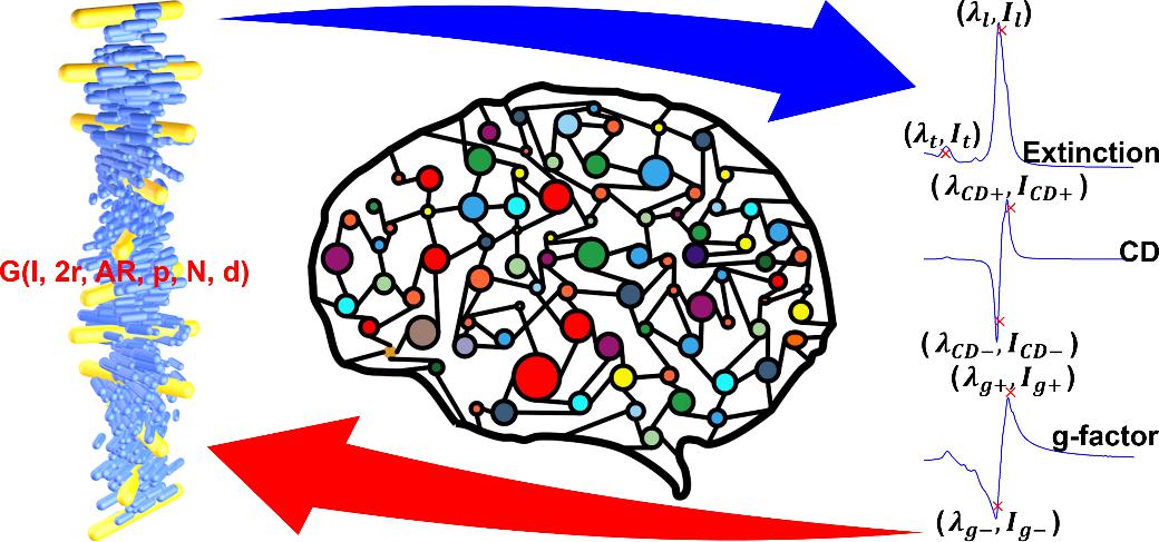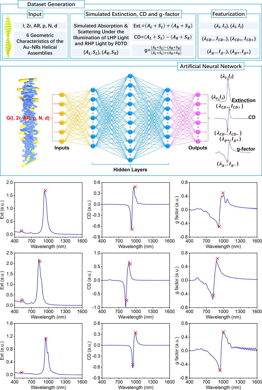 图1. 研究思路图。 在前期工作中,刘洋聚焦于胆甾相液晶中金纳米棒螺旋扭曲微结构的构建,成功制备出具有光触发不对称可调谐特性的手性金纳米棒螺旋结构(Adv. Optical Mater. 2024,2400862)。随着研究深入,刘洋意识到,实现对该类微结构的高效“结构—性能”预测对实验研究具有重要指导意义。为此,刘洋指导硕士研究生陈永光、羊博等,基于时域有限差分法(Finite Difference Time Domain,FDTD)仿真自主构建了专用数据集,系统分析了金纳米棒螺旋结构特征与光学非对称性参数(如消光、圆二色谱及g-因子)之间的内在关联,分别开发了用于预测光学非对称性特征的神经网络,以及基于粒子群优化算法(PSO)的逆向结构反演方法。