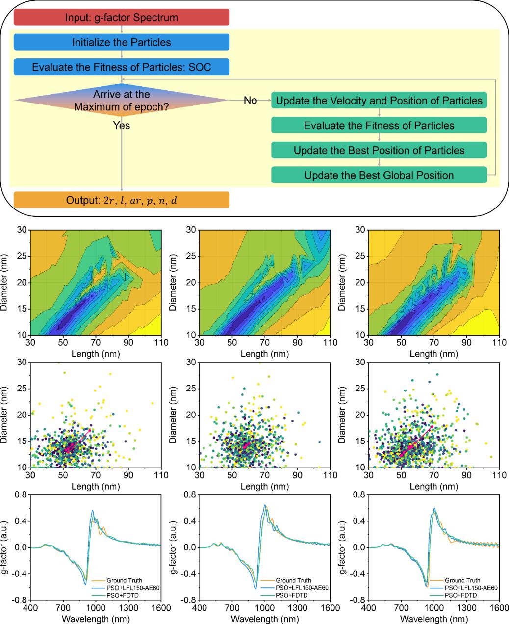 图5. 结合LFL150-AE60网络优化后的PSO算法示意图,及其反演过程中的搜索轨迹与结果对比。 刘洋团队进一步将LFL150-AE60网络与粒子群算法结合,优化了用于反演金纳米棒螺旋结构形貌特征的PSO算法(图5)。升级后的PSO–LFL150-AE60算法具备更高的操作便捷性,仅需输入目标g-因子谱图,即可直接反演出对应的结构形貌参数。结果显示,基于该算法反演得到的结构参数所重建的g-因子谱图与输入目标高度一致。这一成果进一步巩固了PSO–LFL150-AE60算法在微结构逆向设计中的优势,为面向光学非对称性的微结构精准设计提供了可靠手段。 本研究由刘洋主导,我校2023级控制科学与工程专业硕士研究生陈永光、2023级信息与通信工程专业硕士研究生韦喜洋及2024级电子信息专业硕士研究生羊博承担主要任务。信息与智能科学学院尚建华副教授与香港城市大学赵利娜助理教授亦作出重要贡献。研究获国家自然科学基金、上海市自然科学基金、中央高校基本科研业务费专项资金及香港研究资助局RGC项目共同资助。 论文信息: