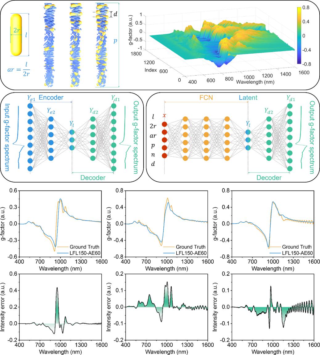 图4. LFL150-AE60网络预测g-因子谱图的示意图,及其预测结果与FDTD仿真结果的偏差。 通过对神经网络结构的进一步优化,研究团队开发出LFL150-AE60网络,实现在400–1600nm宽波长范围内对g-因子谱图的高精度预测,预测值与实际结果的相关系数达0.983(图4)。与传统的FDTD仿真相比,LFL150-AE60网络的预测速度提升了八个数量级,展现出更加卓越的计算性能。该成果标志着团队在金纳米棒螺旋结构关键光学参数的预测与谱图生成方面取得重要突破,为微结构的光学设计与性能调控提供了高精度、高效率的计算工具。