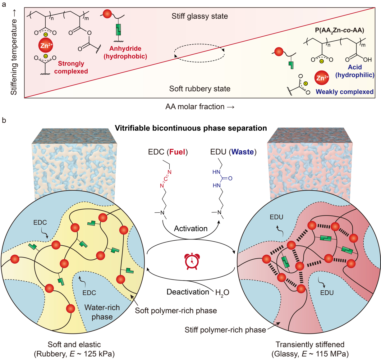 生命体系对环境的高度适应性源于其时刻处于非平衡状态,通过消耗化学燃料随时改变材料性能。例如,肌肉可以在ATP供能下收缩并硬化,完成任务后又恢复柔软。受此启发,研究人员开发了多种人造非平衡材料,其力学性能在特定燃料作用下可随时间发生可逆变化。然而,现有的非平衡材料即使在硬化状态下仍过于柔软(模量通常小于1 MPa),这严重限制了它们在力学承载等实际场景中的应用。 该团队近期研究发现,现有非平衡材料大都基于小分子组装或均一网络结构,其无法剧烈硬化的根本原因在于缺乏有效的玻璃化转变机制。他们提出,将非平衡化学与玻璃化相分离相结合,有望实现非平衡材料的剧烈可逆硬化。为此,他们合成了丙烯酸锌-丙烯酸(PAA2Zn-co-AA)共聚物水凝胶。其中,聚丙烯酸锌为典型LCST型热致硬化高分子,在硬化温度以上可发生橡胶态-玻璃态相分离转变。丙烯酸则扮演双重角色:一方面可在室温附近调控该水凝胶的硬化温度,另一方面可被化学燃料EDC催化脱水形成酸酐,而酸酐又随时间自发水解变回丙烯酸。这一EDC燃料驱动的非平衡转化可促使共聚物水凝胶硬化温度在室温附近切换,从而诱导材料瞬态硬化。在化学燃料刺激下,该水凝胶可从柔软的橡胶态(~125 kPa)可逆转变为坚硬的玻璃态(~115 MPa),模量提升高达920倍。这一模量不仅创下了人造非平衡硬化材料的模量纪录,也是首次将非平衡材料的硬化态推进到了玻璃态。此外,该水凝胶还展现出可编程的寿命和优异的循环性能。