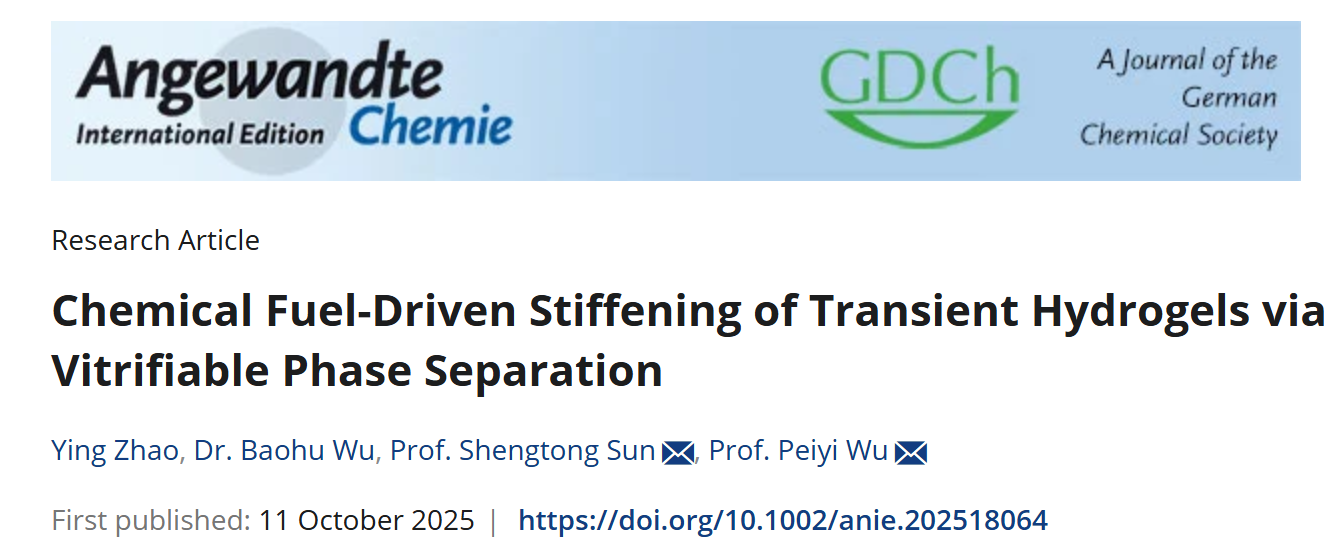 近日,我校化学与化工学院与先进低维材料中心武培怡-孙胜童联合研究团队在瞬态硬化水凝胶的研究上取得进展,相关成果以《通过玻璃化相分离实现化学燃料驱动水凝胶瞬态硬化》(Chemical Fuel-Driven Stiffening of Transient Hydrogels via Vitrifiable Phase Separation)为题,发表在《德国应化》(Angewandte Chemie International Edition,2025, 64, e202518064)上。