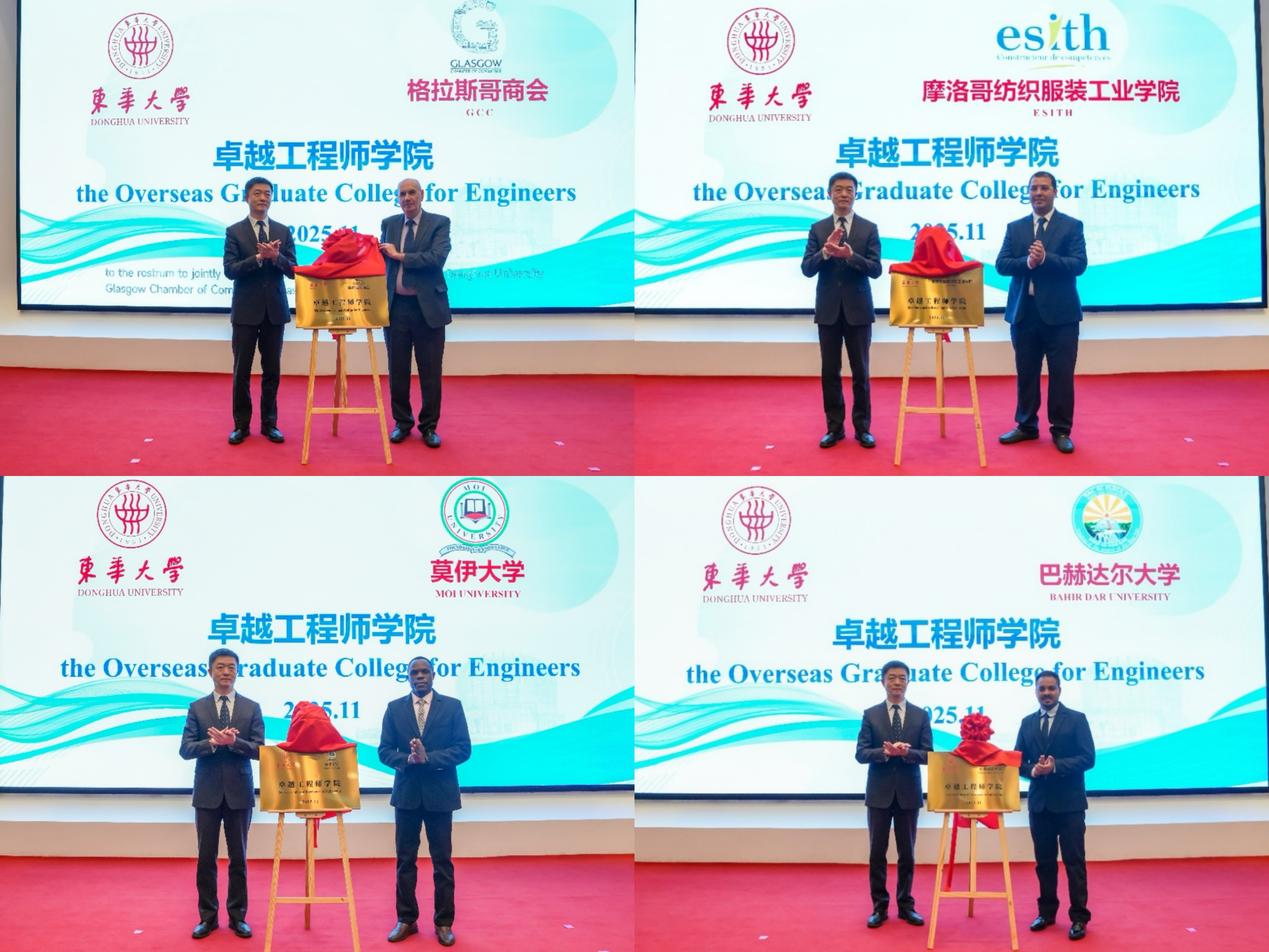 (海外卓越工程师学院揭牌) 我校与苏格兰格拉斯哥商会、摩洛哥纺织服装工业学院、肯尼亚莫伊大学以及埃塞俄比亚巴赫达尔大学共建海外卓越工程师学院并揭牌,致力于打造国际化的卓越工程教育平台,传播中国卓越工程师培养经验。我校还与中国机械工业集团有限公司、中国通用技术(集团)控股有限责任公司签署协议,联合培养“产学研用”一体化的工程人才。 会议期间还举办了世界纺织大学联盟指导委员会闭门会议及多边对话,产教融合与产学研国际合作研讨会暨世界纺织大学联盟年会和东华大学绿色纺织产学研融合成果展。