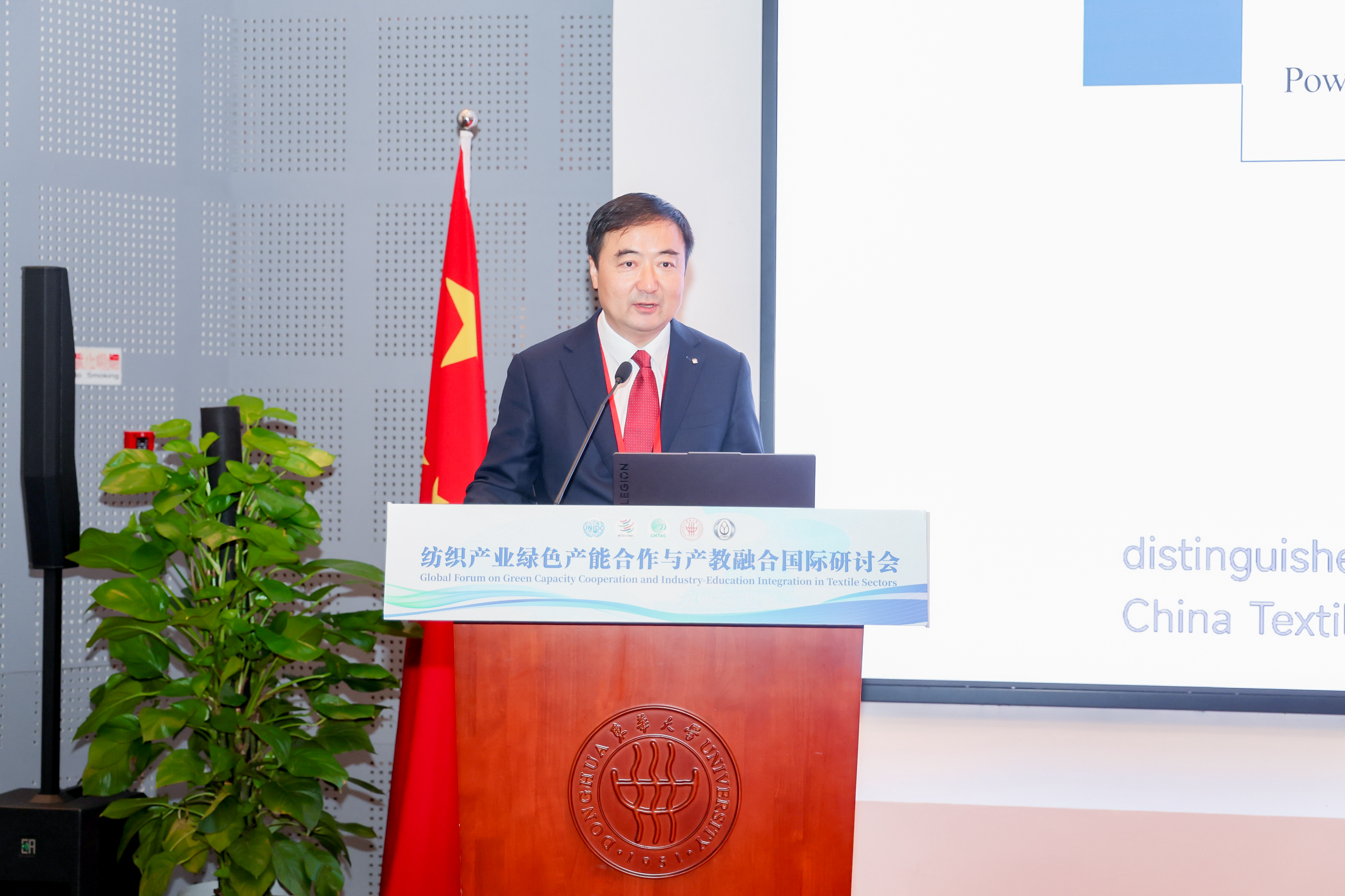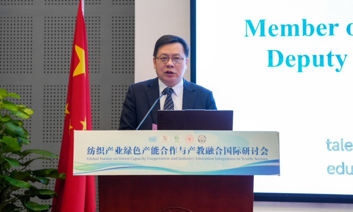(项延训致辞) 项延训向与会的国内外嘉宾表示热烈欢迎,并对联合国工业发展组织、世界贸易组织等机构及兄弟院校和企业单位的支持表达感谢。他指出,深化绿色产能合作、加强产教融合,是纺织行业迈向低碳、创新驱动与包容性未来的关键路径,也是落实联合国可持续发展目标的生动实践。东华大学发挥特色优势,努力开展高质量科学研究和成果转化,在绿色低碳、智能纺织等领域取得了一系列成果;积极开展高水平国际交流合作,构建了互学互鉴、共享共赢的新格局。期待与各方加强在绿色纺织科技、行业标准共建和高端人才培养等领域的国际合作,共同构建开放、包容、协同的全球纺织教育生态,为行业转型升级和可持续发展作出更大贡献。