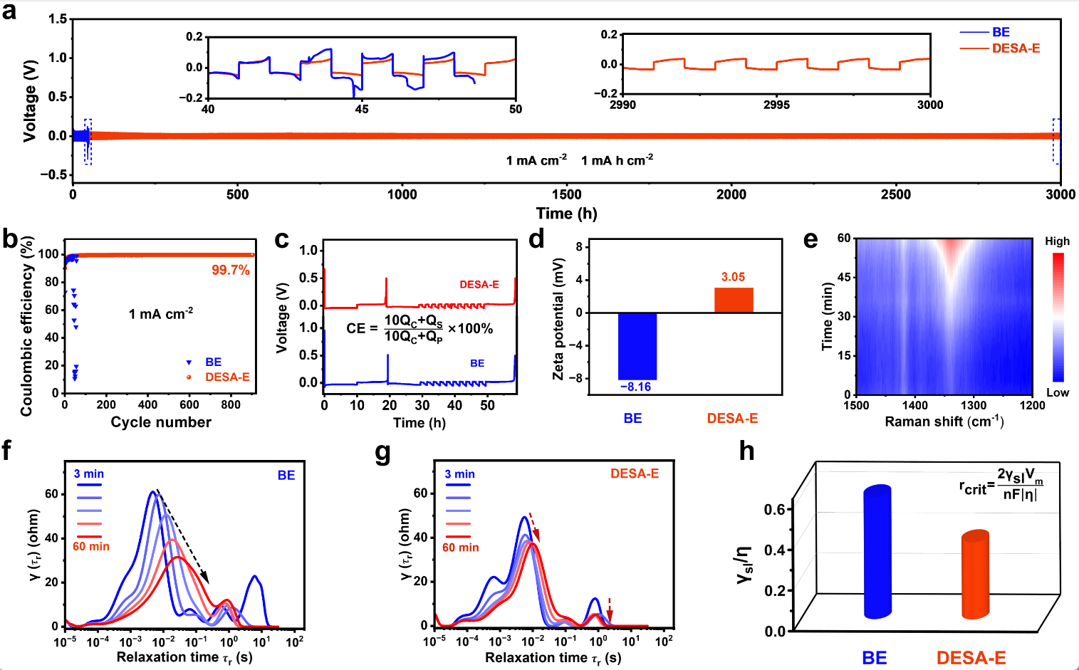 图4 BE和DESA-E对Zn/Zn和Zn/Cu电池电化学性能的影响 DESA-E 体系显著优化锌沉积/剥离性能,对称电池在1mAcm–2下稳定循环3000小时,不对称电池可运行900 次,远超传统 BE体系。其[PeMIM]+吸附锌表面,降低水分子吸附并形成静电屏蔽,引导Zn2+均匀沉积,实现界面稳定性与动力学协同提升(图4)。