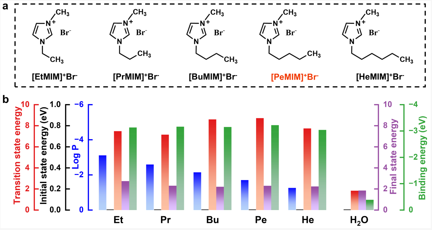 图1. 不同烷基链长咪唑溴盐的筛选 为筛选最优咪唑鎓盐添加剂,研究团队系统比较了不同烷基链长度的 [EtMIM]+Br– 至 [HeMIM]+Br–。理论计算表明,[PeMIM]+Br– 体系具有最高 I⁺ 水解能垒与最强 IBr2– 结合能力,表现出优异稳定性。最终确定0.5M[PeMIM]+Br– 为最优体系(DESA-E)(图1)。