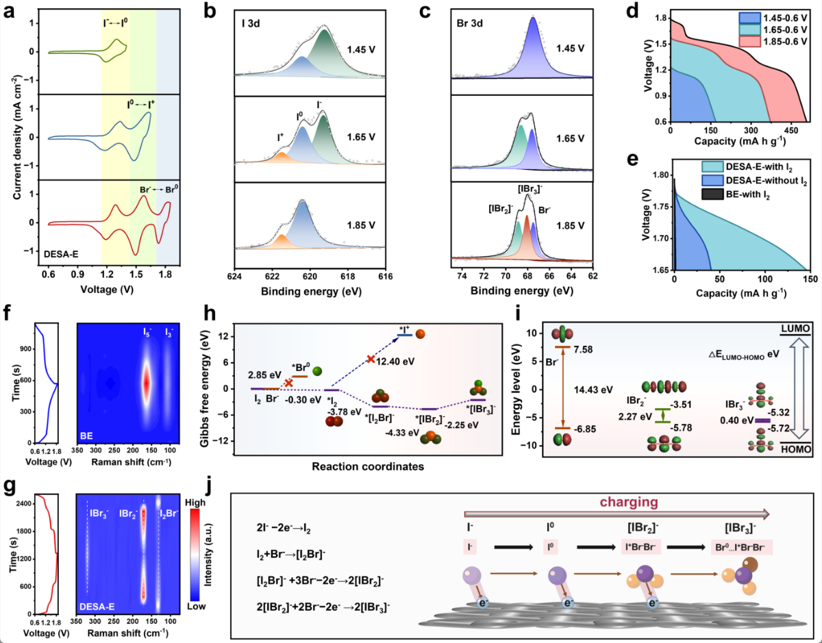 图2. 双卤素电池的电化学机理 不同电压窗口下依次出现的三对可逆氧化还原峰,揭示了由I–/I0向I0/I+及Br–/Br0的多电子转化过程。双卤素协同作用显著提升Br–/Br0利用率(8.9% → 31.2%),并经XPS、原位拉曼及理论计算得到验证(图2)。