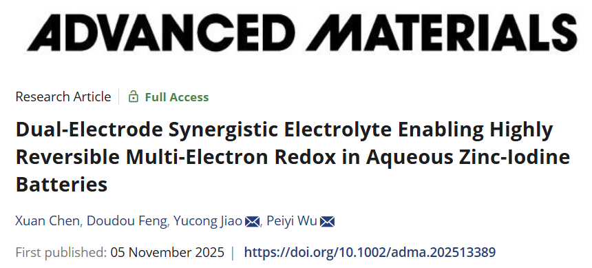 近期,东华大学化学与化工学院武培怡/焦玉聪团队提出了一种双电极协同电解质(DESA-E),构建了高度可逆的多电子Zn–I2电池(方案1)。