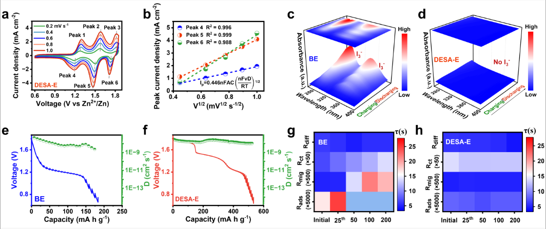 图3 不同电解质体系下阴极的氧化还原动力学 综合电化学与原位光谱结果表明,DESA-E 体系显著提升了碘的氧化还原动力学与多电子反应可逆性,抑制I3–积累并降低界面极化,实现快速稳定的多电子转移过程。(图3)。