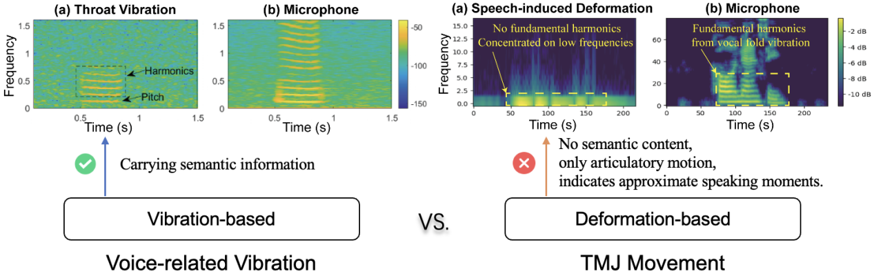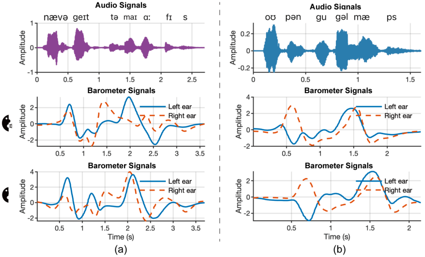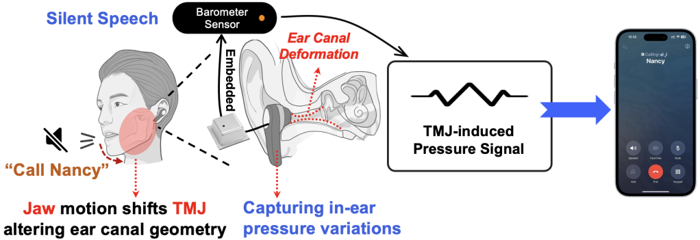 近日,信息与智能科学学院常姗课题组在智能可穿戴与人机交互(HCI)领域取得重要进展,相关研究成果被 CCF A 类国际会议INFOCOM 2026 录用。这也是该课题组在该领域取得的系列重要进展之一。到目前为止,课题组已经在相关领域发表了多篇 CCF A/B 类会议及期刊论文。 语音是人机交互中最自然、最高效的模态之一,并日益成为移动设备、可穿戴系统和智能助手的主导输入接口。根据最新预测,全球语音识别市场在未来几年依然呈现快速增长趋势。但是语音交互在实际应用中仍面临诸多挑战,特别是在嘈杂环境、隐私敏感场合或针对语音障碍人士时。所以无声语音接口应运而生,其旨在不发声的情况下准确理解内容,这为在无法使用或不方便使用语音的场景下,通过无声语音接口实现自然且鲁棒的人机交互提供一种极具前景的解决方案。 但现有的基于视觉、无线信号或惯性传感器的无声语音接口方案常面临侵入性强、环境敏感或部署复杂等问题。本研究提出一种名为Baro2Talk的新型耳戴式无声语音交互系统,如图1所示,Baro2Talk设计的核心见解是:即使在无声状态下进行的言语发音,也会引起耳道压力的微妙波动。这些压力变化主要由以颞下颌关节(TMJ)为主的(连同下颌、舌头及其他周围口腔结构)发音运动驱动,展现出一致且包含语义信息的模式(如图2所示)。本研究将这些序列称为颞下颌关节主导的压力变化序列(TPVS)。这为建立耳内压力变化与其根本原因(TMJ运动)以及最终语义之间的映射模型提供了契机。