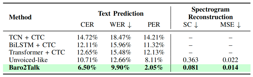 图6 梅尔语谱图重建效果对比 本研究跨越六个月,收集来自25名参与者(包含无声和有声发音条件)的数据集对该系统进行了评估。如表1所示,该系统在文本预测和梅尔语谱图重建方面均由于代表性的SSI基准方案。 表1 不同方法的文本预测精度和梅尔语谱图重建效果