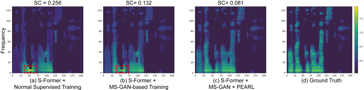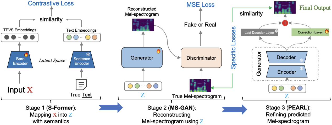 图4 不同生理机械运动下的梅尔语谱图差异对比 为此,如图5所示,本研究提出一个三阶段梅尔谱图重建管道,将语义理解与梅尔谱图生成解耦。首先,名为S-Former的语义编码器将句子的完整TPVS映射到与其文本嵌入共享的潜在语义空间,避免了对齐需求。其次,利用学习到的潜向量通过生成式网络MS-GAN逐步生成粗粒度梅尔语谱图。最后,通过自适应残差学习实现的音素增强(PEARL)对其进行精细化,从而在无声学监督的情况下实现梅尔语谱图的高保真重建。