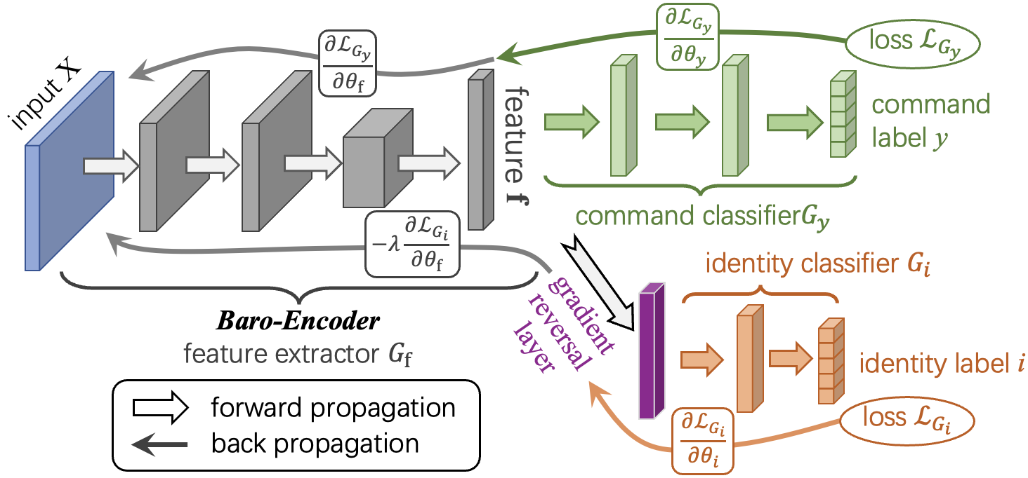 图2 来自两个短语的TPVS示例 为此,本研究将微型气压计嵌入标准耳塞中以捕获TPVS,并利用其重建梅尔语谱图,而非直接还原文本内容。这是因为压力信号的采样率(约100 Hz)远低于音频信号,导致低频TPVS与高维文本嵌入之间存在显著的维度失配。直接将TPVS映射到文本将需要海量的数据。相比之下,梅尔语谱图将TPVS转化为符合语音特征的高频表示,在桥接模态差异的同时保留了共振峰和基频轮廓等关键特征。此外,由于梅尔语谱图是通用自然语音识别系统(如Whisper)的标准输入,所以成为了理想的中间表示。然而,本研究仍然面临三个关键挑战:1.低信噪比与易受干扰的压力信号。本研究提出一套数据预处理流程,包括直流漂移去除、带通滤波和信号放大,以降低噪声并清晰化形变信号。并通过局部稳定性检查增强的短时能量检测方法,从连续的TPVS中提取无声语音形变事件;2.用户间差异与节奏多样性。如图3所示,本研究使用领域对抗学习训练了一个Baro-Encoder,以提取用户不变的语义特征。同时,设计了一种基于节奏感知的数据增强策略,生成TPVS的时域扭曲变体,增强对说话速度变化的鲁棒性;3.非声学模态与缺乏细粒度监督。如图4所示,与基于声带或扬声器振动的语音信号不同,TPVS源于人类内部发音动作,不含声能。其频谱图在语音领域并非固有有意义,使得直接映射到音频频谱图变得不可行。此外,无声语音缺乏对齐的音素或帧级标签,阻碍了传统监督回归或基于对齐模型的使用。