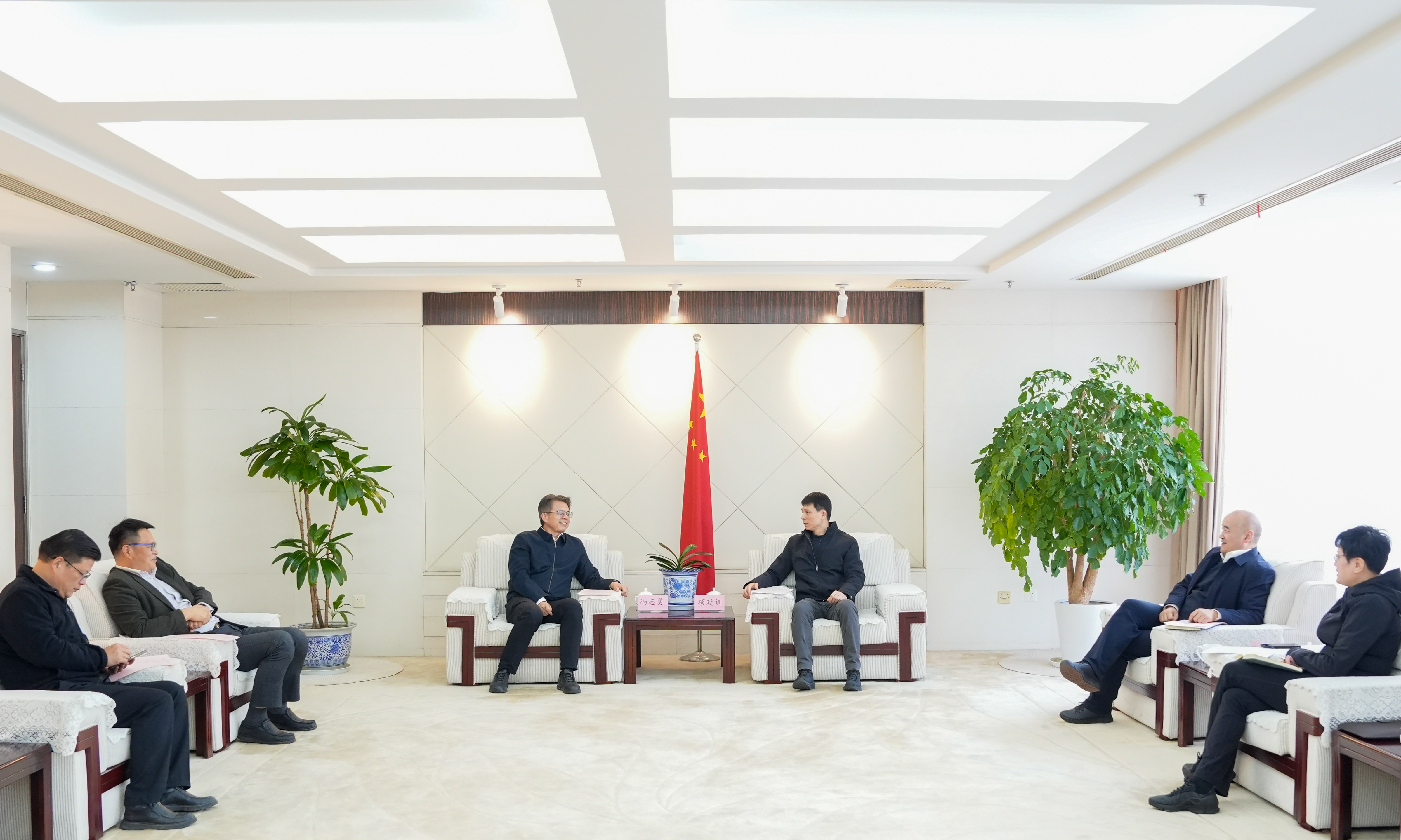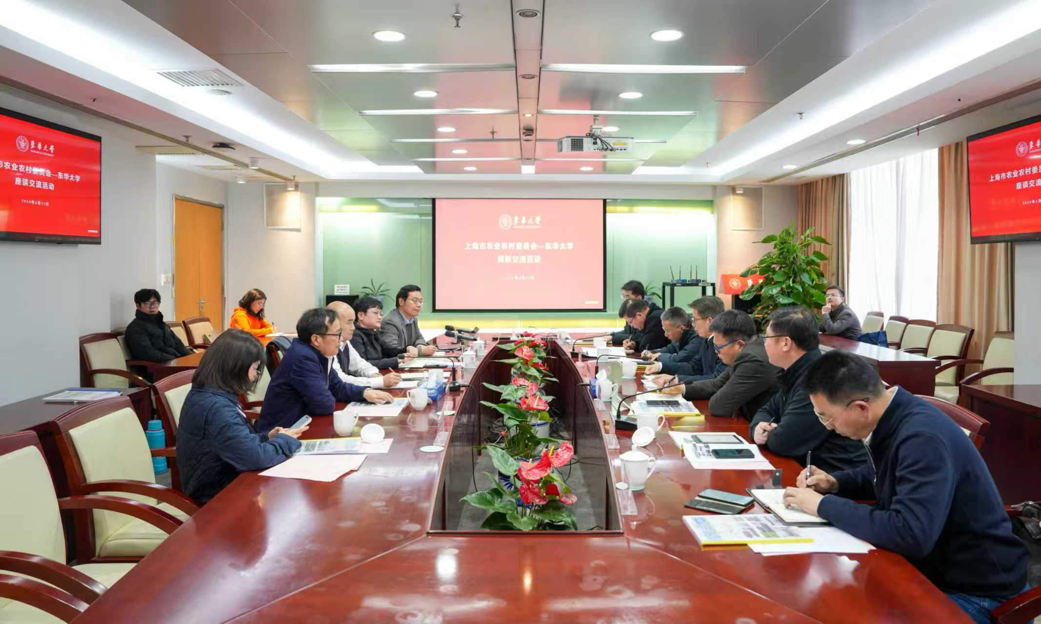(项延训会见冯志勇一行) 项延训代表学校对冯志勇一行来校调研表示欢迎。他指出,东华大学积极拓展学科专业优势,推进科研成果转化,在环境污染修复治理、功能性农用新材料、农业智能装备等领域取得系列成果,赋能农业现代化建设。他强调,学校将主动对接行业需求,深化创新平台共建,锚定关键领域技术攻关,进一步提升成果转化效率,开创校地协同服务乡村全面振兴新局面。 冯志勇对东华大学发挥学科优势,积极主动对接全面推进乡村振兴需求,服务农业农村现代化表示赞赏。对东华大学有机固废1小时腐熟技术等为代表的农业新技术应用转化给予肯定。他表示,聚焦上海都市现代绿色农业发展需求,市农业农村委将进一步深化与高校的交流合作,强化政策引导、资源整合和服务保障,助力上海都市现代绿色农业高质量发展,为乡村全面振兴注入强劲科技动能。